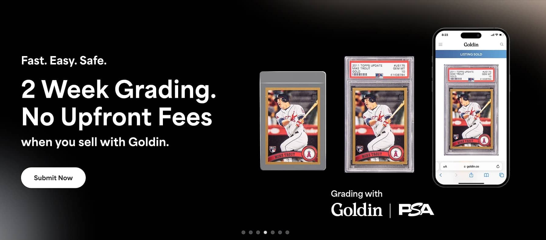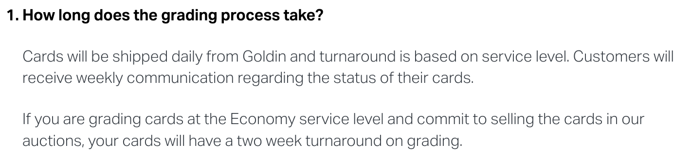 Looks like that “two week grading” is just PR bullshit as you have to submit at what I can only assume is the Value Plus tier (Economy doesn’t exist anymore at PSA). It doesn’t appear that Goldin offers any faster turnaround times if you submit to sell via their service as opposed to sending direct to PSA.