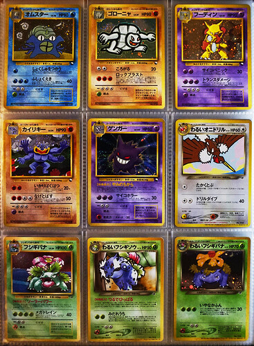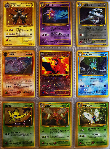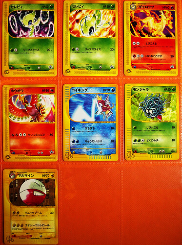 Here we have that utterly gorgeous neo set exclusive page, plus the trainer steelix (yes, yes, I love the CG in it), and of course, why not garnish such a splendor with 'ole maggie, Kinebuchi’s finest. When in doubt, add a Keiji, I always say. My personal favorite of the neo exclusives is the Kingdra. my god, what a banger. I actually find this to be one of the best Pokemon cards ever made, honestly.