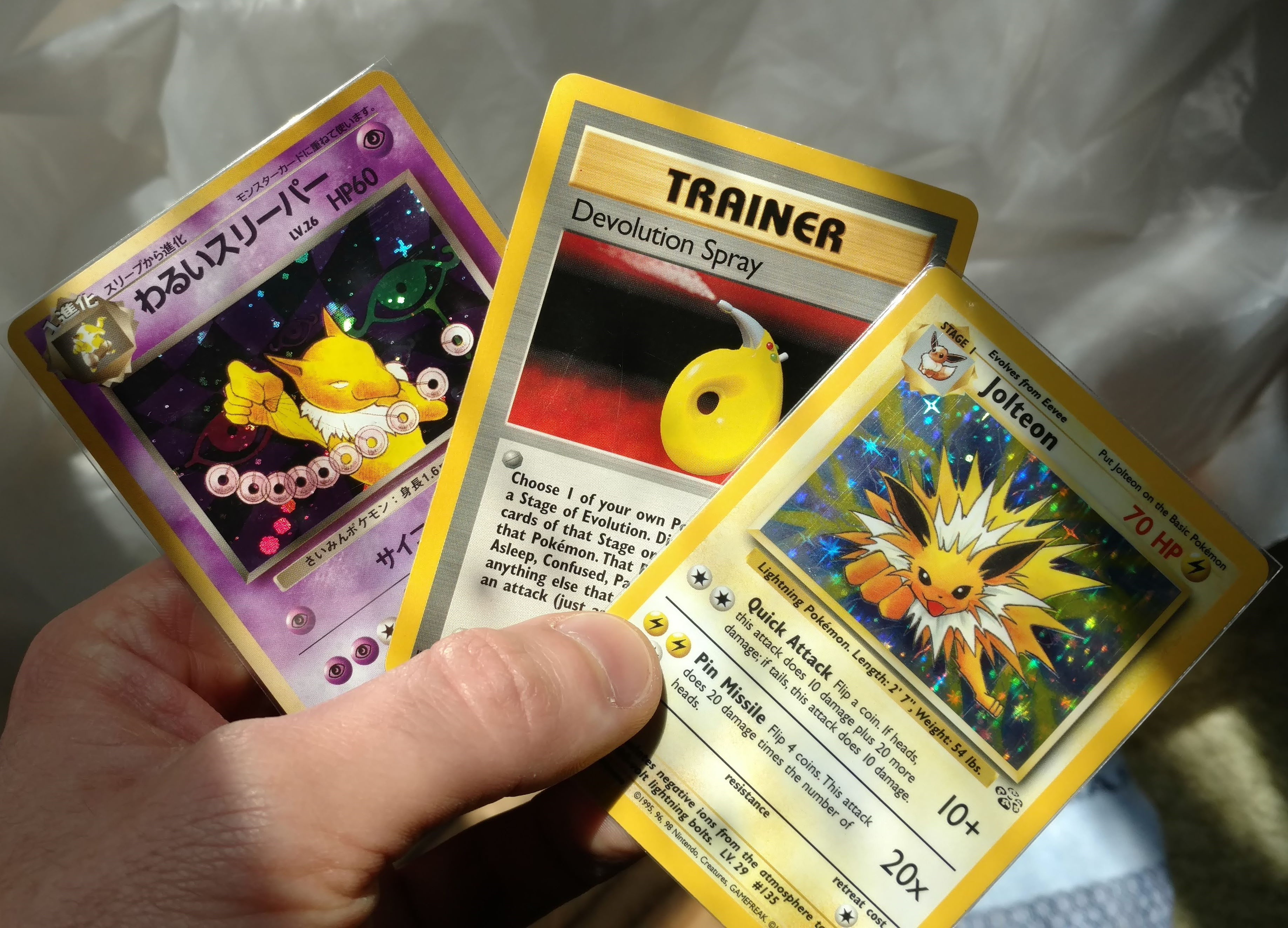 Anyway, those two packs contained a holo Snorlax and a holo Jolteon. I traded the Snorlax for a much cooler Mewtwo promo, but I still have the Jolteon, which is also my favorite artwork of the Jungle set. As a kid I used to reorganize my collection ALL THE TIME. Sometimes sorting them by index, sometimes by type, sometimes by evolutions, etc. Being unsleeved and moved in and out of the binders all the time, the condition is obviously pretty bad. But it’s still nice that I have these original cards from back then, and being played give them some charm for what they are imo.