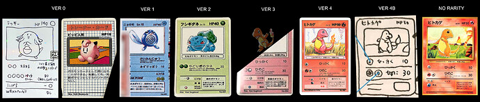 By January 1996, the final revisions for the test cards are completed, namely the card attacks and other card rules/effects (Aim! Lizardon Tournament History Book). Final artwork and card design was finalized months later. Although it is mentioned that there were many revisions through hundreds of play tests, it might be possible to categorize the stages of development for these test cards.