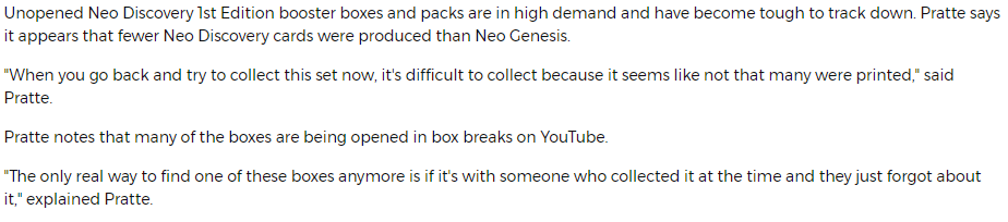 Here is my anecdote about the popularity of Pokemon in Denmark in 2001 and early 2002. Neo Genesis was widely popular and for a little while sparkled renwed interest in Pokemon cards after it had mostly disapeared from the school yard craze during the Gym sets period. We had both 1st edition and unlimited boosters widely available at this time. Most of us played Gold/Silver, and Neo Genesis was just a very exciting set. But this “second wind” of Pokemon hype did not last that long as we moved on to other things… Note that Neo Discovery first came out half a year later, which is a very long time for kids, and it was during the summer holidays of 2001. By then me and one of my friends were the only one I knew at my school that got Neo Discovery cards. And we only had unlimited cards of this sets. In autumn 2001 when Neo Revelation came out, only a few “nerdy kids” still collected and played Pokemon at my local card shop. We also only got unlimited Neo Revelation cards. Pokemon as a fad was long dead at this time. By the time Neo Destiny came out in early 2002 I had also stopped playing and collecting the cards. In terms of print runs and the availability of cards, Neo Genesis certainly feels much more common in both 1st edition and unlimited relative to the other Neo Sets, and this makes good sense when taking the timeline into consideration.