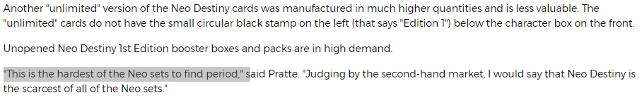 I’m trying to complete a Neo Block Binder and destiny seems to be the hardest to find/most expensive on average (not counting shinings). Am I crazy or did they lower the print run on destiny?
