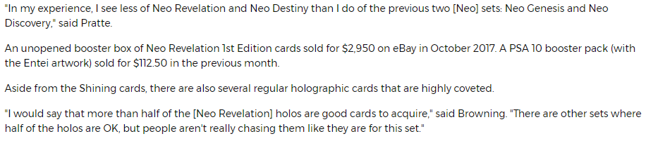 Anecdotally, I collected all Neo cards at the time except Neo Destiny, which I didn’t even know existed! I would love to go back to the time between Rev and Destiny release and see what was happening at the time e.g. a new big game coming out or a film, a new craze etc… something that broke the camels back. Even as someone collecting Neo cards, it became more of a secret hobby for me due to how much everyone else had stopped caring about them. Maybe with each Neo set, sales just kept getting worse and worse (Neo genesis would have had the most hype, being the base set of gen 2, then I feel like the rest fell off a cliff). I don’t remember ever seeing Neo Destiny in shops at all.