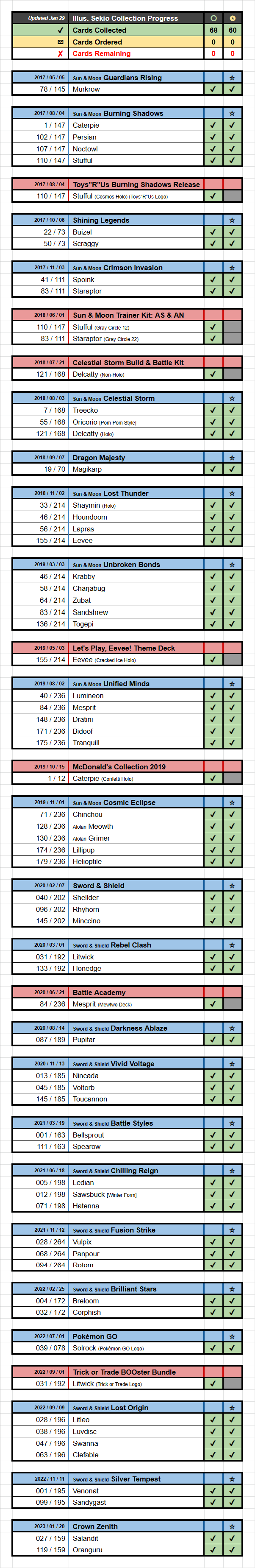 For some of my focused separated collections however, like Pikachu or Seviper (which I collect in all languages/variations), I group the same artwork across different sets together (e.g. the Base Set Pikachu artwork is also in Base Set 2 and XY Evolutions, and also has a variation in Rising Rivals and Celebrations, so they’re all grouped together in my binder). Each individual artwork I order further based on languages → holo/non-holo → stamp variations/regular. Here my Pikachu checklist and my Seviper checklist to give you an idea - my binders or sorted exactly as in my checklist (as can also be seen in the imgur-link at the top of my Seviper checklist) - with the exception of the graded/sealed/Jumbo/misprinted cards being in separated binders.
