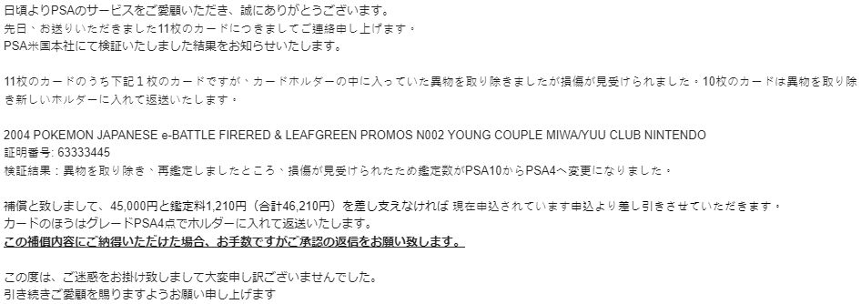 Translation: PSA is sorry to inform you that we reviewed the card again after removing the particle, but then noticed that the card was damaged, which caused the grade to drop from 10 to 4.