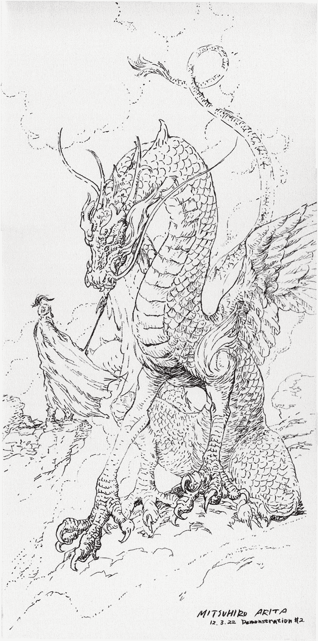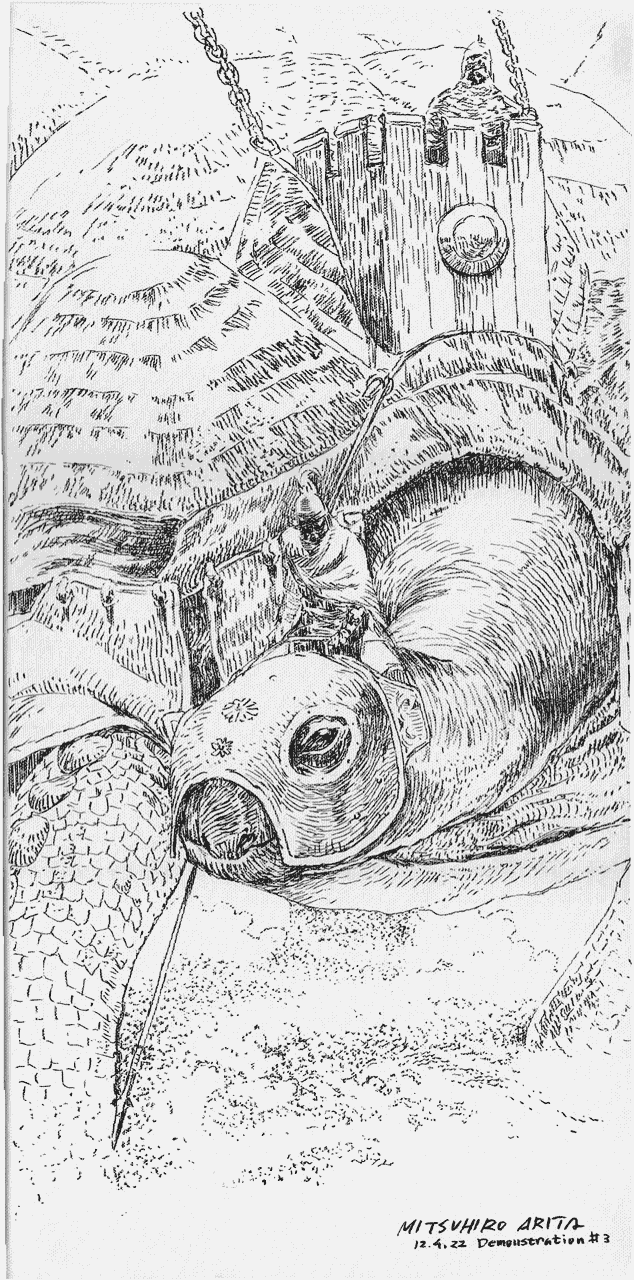 - Arita also said that out of the 3 sketches he did this weekend (frog rider, blue dragon, war tortoise) the tortoise on Sunday was the most challenging. He had to think of a way to draw something wide (the turtle) on a vertical canvas, it was tough to fit everything on there.