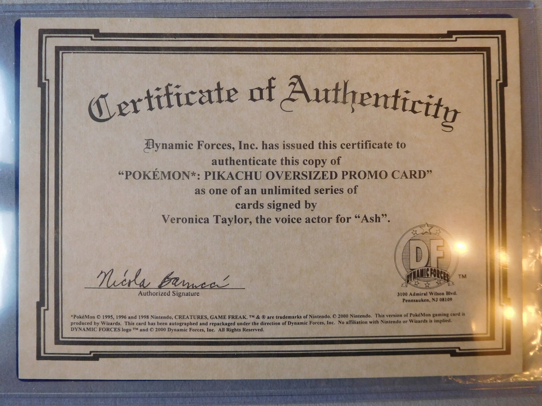 I already had another Pikachu (#27 WotC Promo) autographed by Veronica Taylor, the English voice actress of Ash. But when I saw this Jumbo Base Set Pikachu along with the following certificate, I couldn’t let it pass: