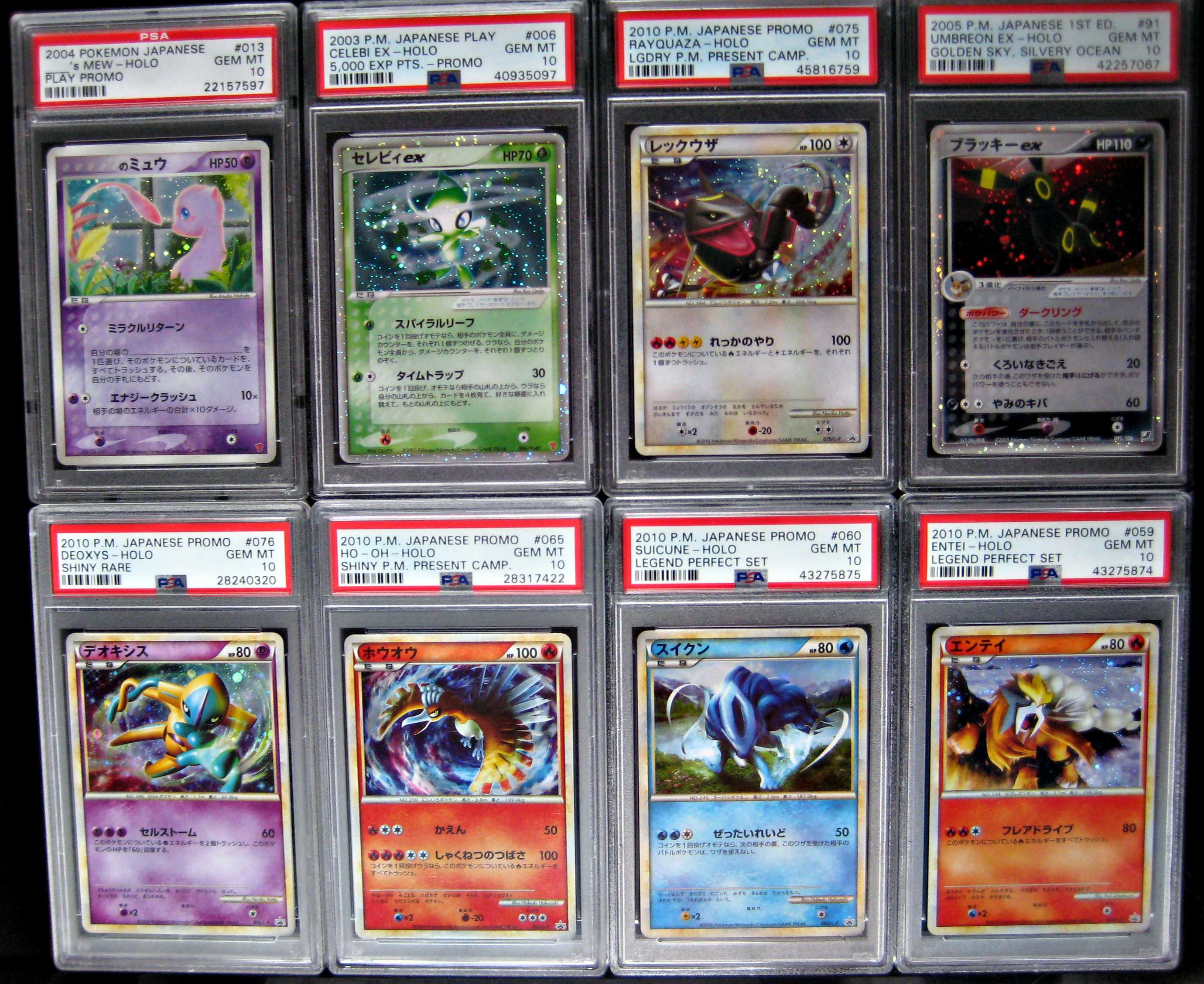 More cards from Gen 3 and Gen 4 (what do we call this, modern vintage?). Play Promos will always be a fan favorite, simply because you couldn’t just pull them out of a pack and because their artwork is awesome and often Japanese-exclusive. Umbreon ex looks amazing in person, like its rings are actually glowing. And then we have some cards from the Gen 4 Shiny Present campaign. Totally underrated cards in my opinion. Distribution of them was extremely limited, for example the Ho-oh has only 1000 copies worldwide. The Entei and Suicune are not part of the Shiny present campaign, instead they could only be purchased on July 10, 2010 at Pokemon Centers and cinemas airing the Zoroark movie. TPC international had no respect for their limited distribution of course, so they put the Legend Perfect dogs in collector tins and the Shiny present campaign cards in the Call of Legends expansion.