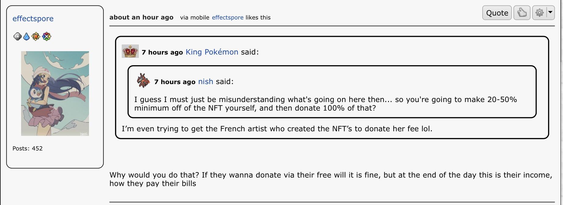to me, this is absolutely not ok unless you have extremely clear permission from Satoshi Tajiri himself. You’re stripping everything away from him as a creator and as a person and boiling it down to “autism made pokemon” and then using that to sell NFTs?