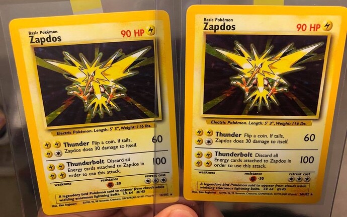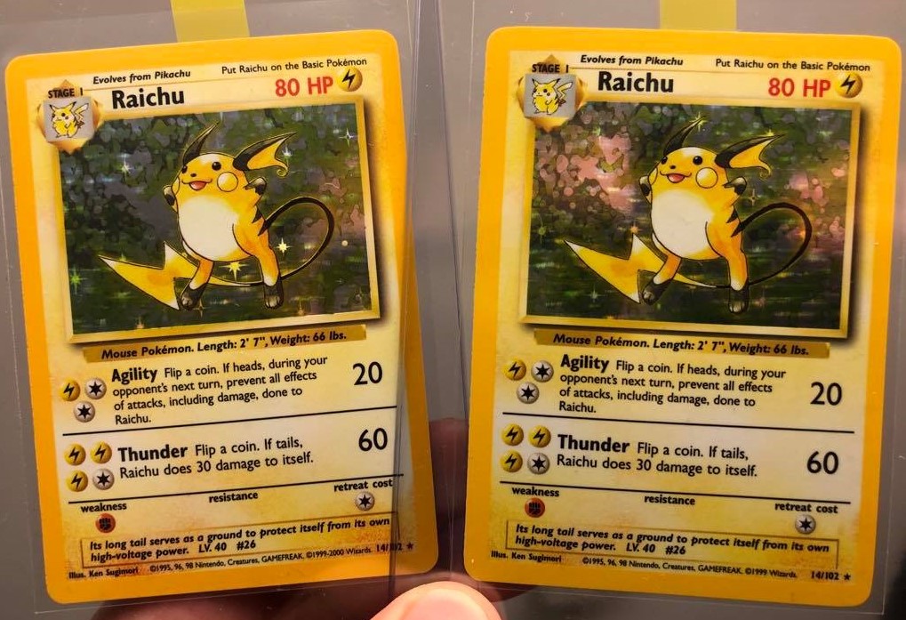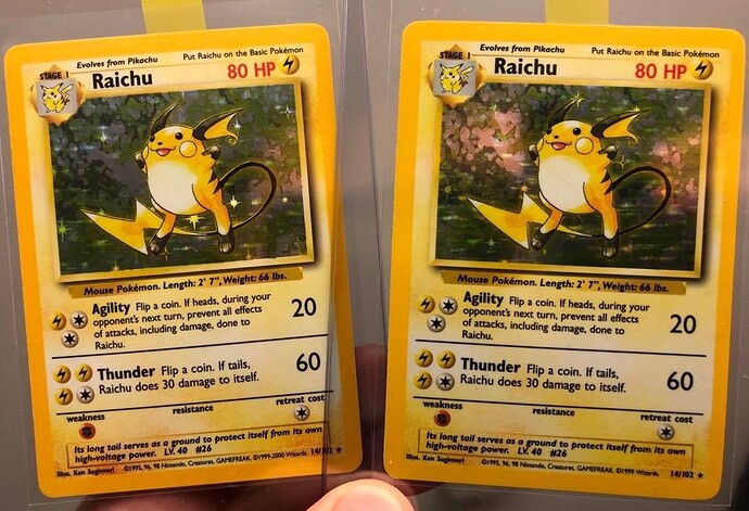 4th/Unlimited followed by Unlimited/4th. Zapdos is near identical, like with Ninetales the background is a bit more purple on the 4th. Raichu on the other hand, difference in saturation and blackish brown is more visible.