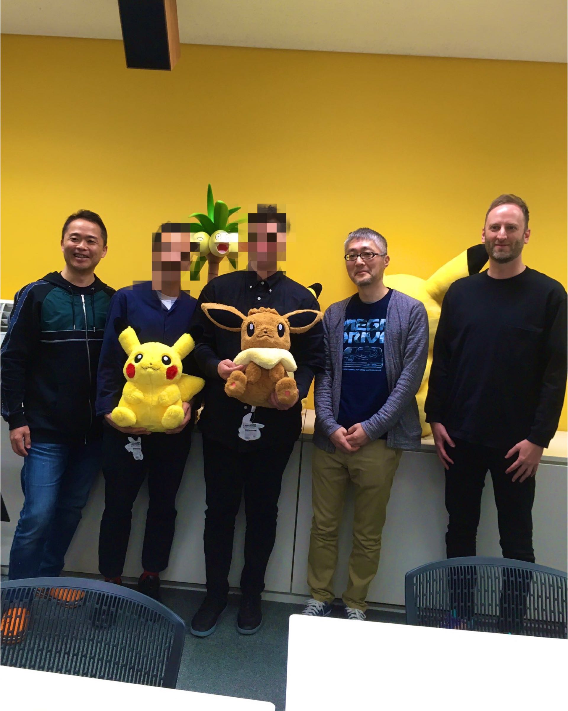 Emily, their partner and Pikachu posing for a photo at TPCI headquaters in Japan.