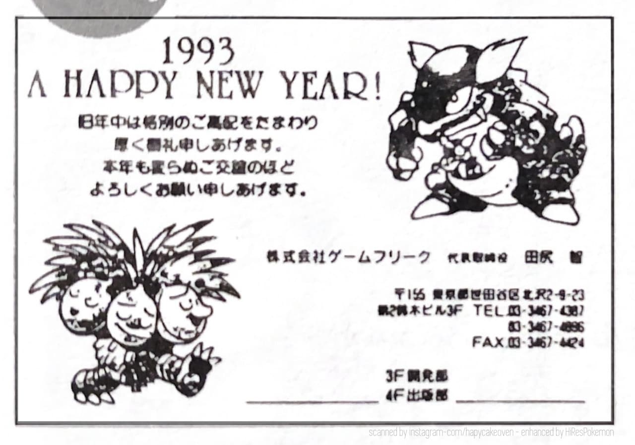 But, going even back to December 1992, a Happy New Year 1993 post card was given internally to Game Freak employees, which depictures early designs of Exeggutor and Kangaskhan: