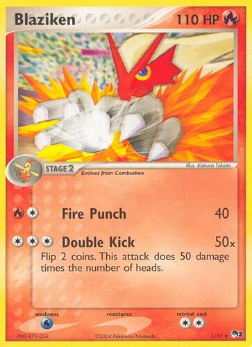 Blaziken has sadly fallen victim to the dreaded Ken Sugimori stock art with weird blur effect. Compared to Blaziken 3/109 from Ruby and Sapphire, there’s no contest.