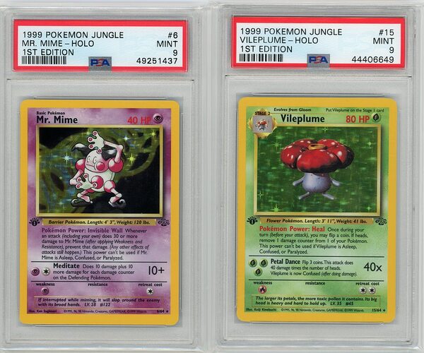 Couple more Jungle 1st Ed auction wins. Thought Mr. Mime got lost in the mail, took a good month to show up. Really like the Vileplume as well, very clean:
